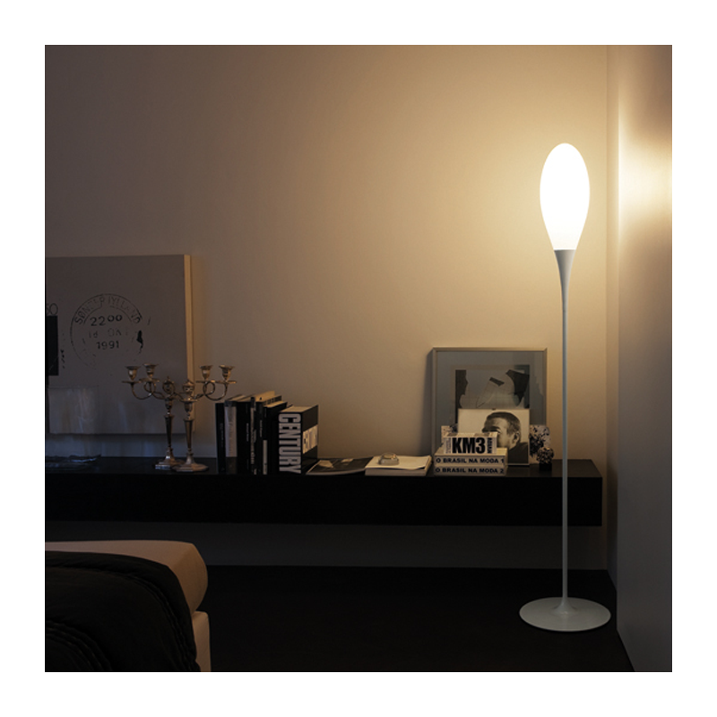 Kundalini Spillo floor lamp Family lamps, luminous objects characterized by a soft shape, ready for a multi directional light emission, but at the same time of atmosphere. Spillo is a suspension lamp made up of a diffuser in polyethylene, rotational printed. Structure and base made up of varnished dust metal.