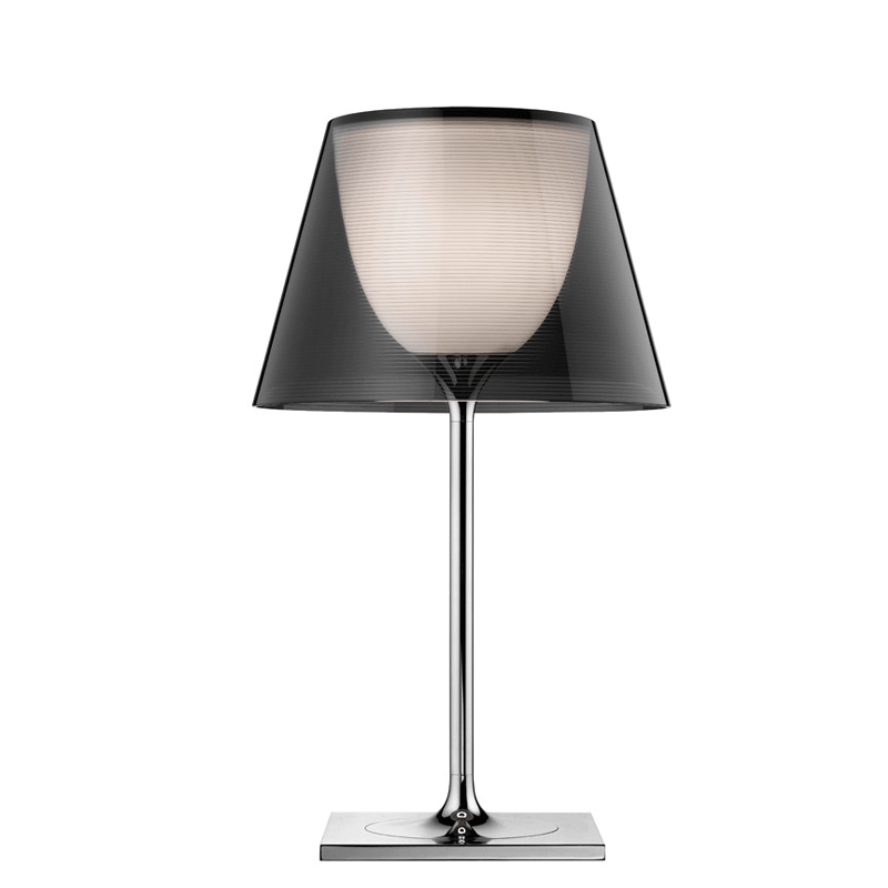 Flos Ktribe T1 Dimmer is a modern glass table lamp, designed by Philippe Starck. Base, rod support and diffuser support in cast polished Zamak alloy. Polished aluminum tubular rod. PA (nylon) matt black injection printed base cover. PC (polycarbonate) injection molded opal color internal diffuser. Outer diffuser in PMMA (polymethylmethacrylate) transparent or fumée.Ktribe T1 is ideal for the lighting of  living rooms and bedrooms.