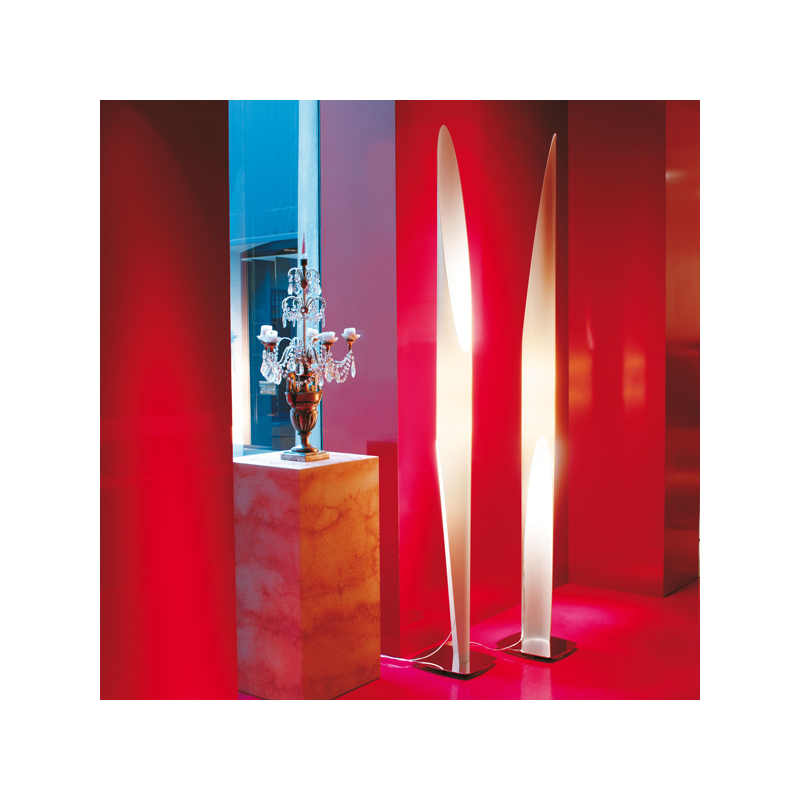 Kundalini Shakti 200 floor lamp Dimmerable lamp with two lights, reading and environment, made up of a plexiglass tubular diffuser, laser cut and assembled on a satined or chromed steel base. This lamp is available in four colors.