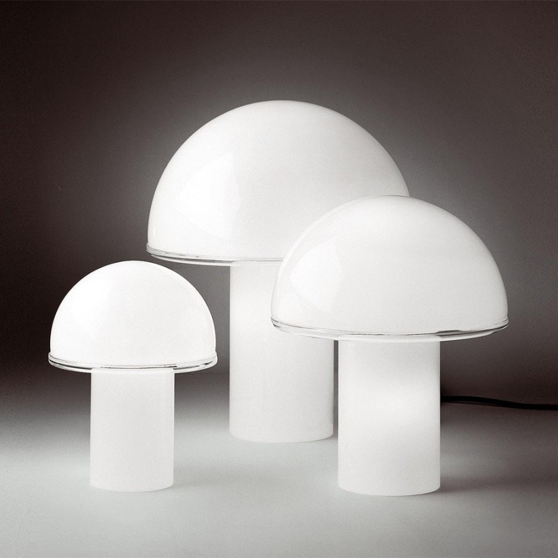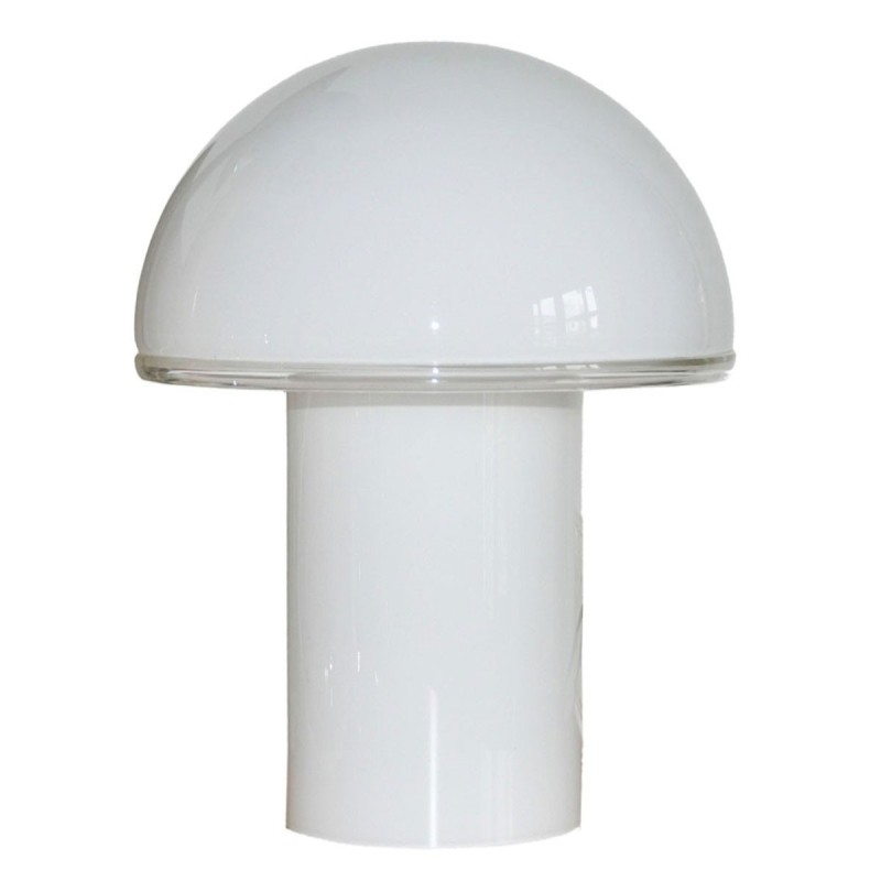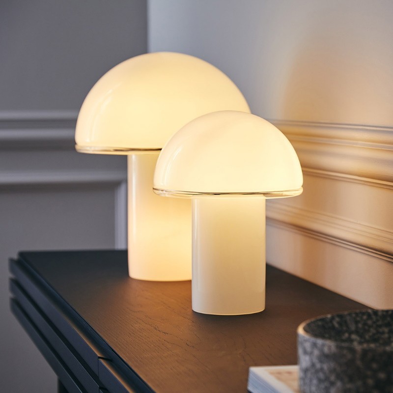 Onfale is a table lamp completely made out of handblown opaline glass and a transparent crystal edge.