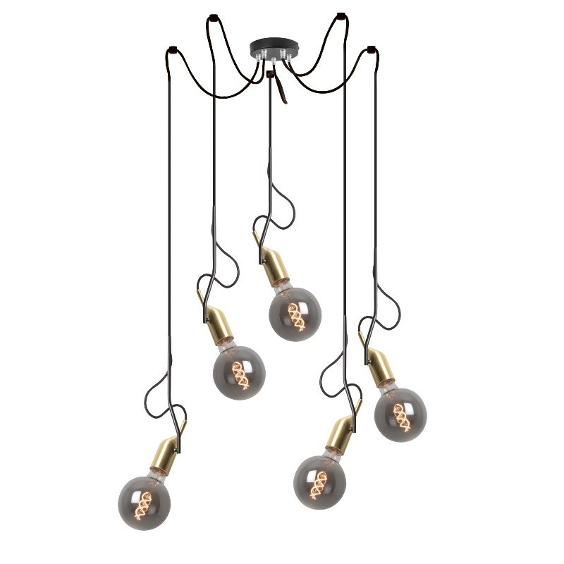 Lampada a sospensione dallo stile vintage composta da portalampada in ottone spazzolato e struttura in metallo nero opaco.